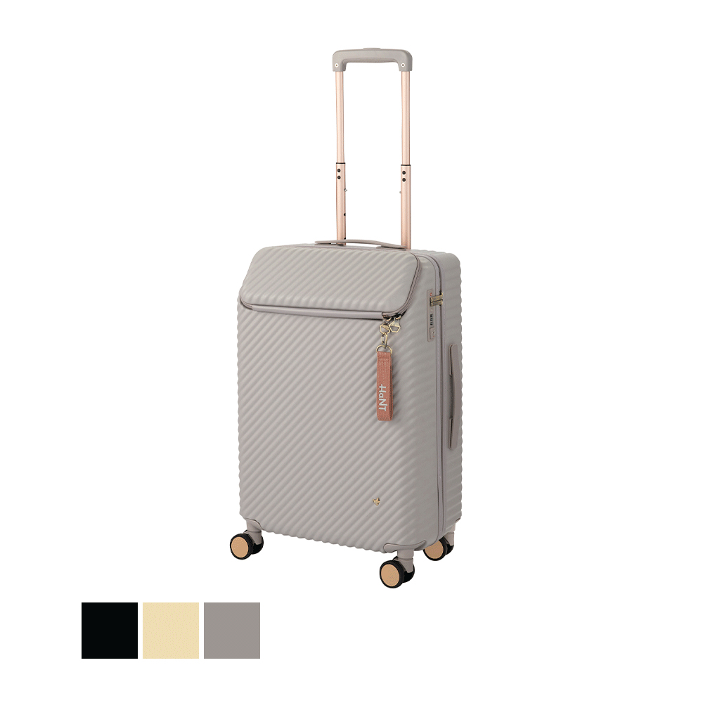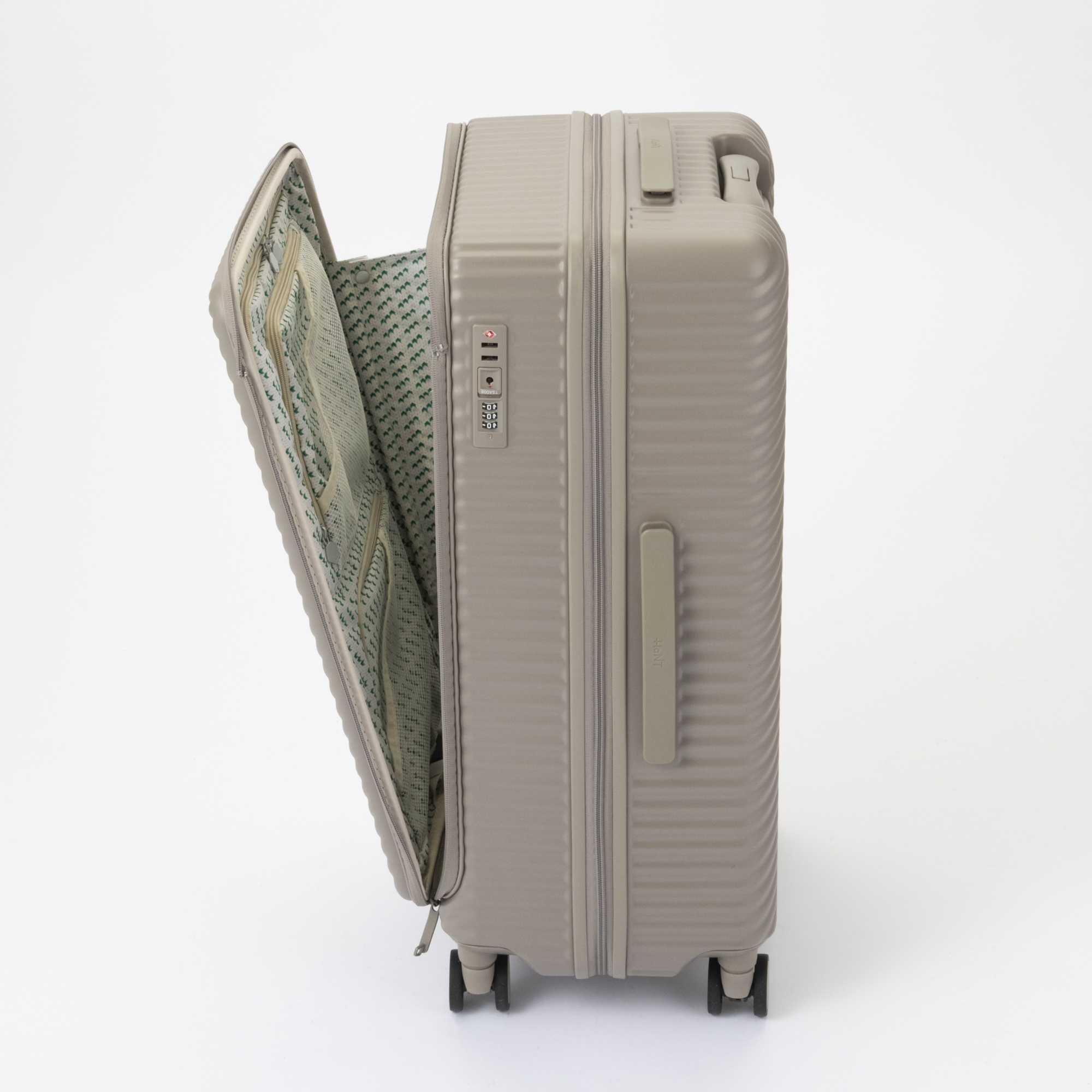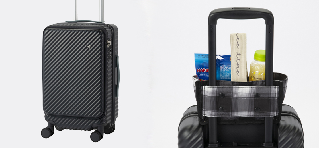スーツケースを立てたまま開けられます。移動中のちょっとした荷物の出し入れを気兼ねなくできるのも嬉しいポイント。